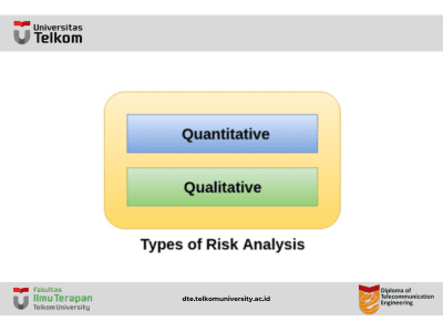 - Mengidentifikasi Risiko Langkah ini digunakan untuk mengevaluasi sistem TI atau aspek lain dari organisasi untuk mengidentifikasi risiko yang terkait dengan perangkat lunak, perangkat keras, data, dan karyawan TI. Ini mengidentifikasi kemungkinan peristiwa merugikan yang dapat terjadi dalam organisasi seperti kesalahan manusia, banjir, kebakaran, atau gempa bumi.