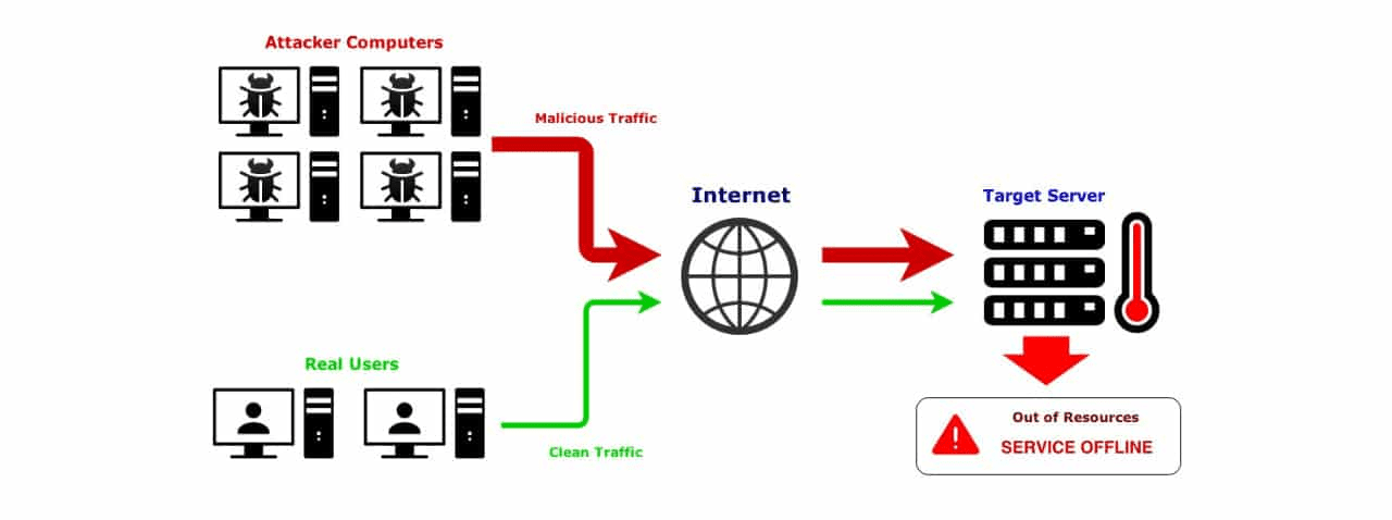 - DoS/DDoS: Ini adalah upaya untuk membuat layanan online tidak tersedia bagi pengguna yang sah dengan membanjiri target dengan lalu lintas yang sangat besar. Lalu lintas palsu ini menghabiskan sumber daya server atau bandwidth jaringan, sehingga layanan tersebut tidak dapat merespons permintaan yang sah dan menjadi lumpuh. Serangan DoS berasal dari satu sumber. Sementara itu, Serangan DDoS jauh lebih kuat karena menggunakan banyak sumber yang terinfeksi (sering disebut sebagai botnet—jaringan komputer yang telah dikompromikan) untuk melancarkan serangan secara bersamaan, sehingga lebih sulit dilawan dan dilacak.