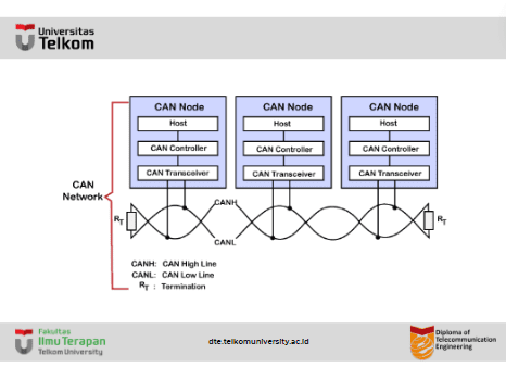 Pada diagram di atas, kabel pasangan terpilin tanpa pelindung digunakan untuk mengirimkan atau menerima data. Kabel ini juga dikenal sebagai bus CAN, dan bus CAN terdiri dari dua jalur, yaitu jalur CAN low dan jalur CAN high, yang juga dikenal sebagai CANH dan CANL. Transmisi terjadi karena tegangan diferensial yang diterapkan pada jalur ini. CAN menggunakan kabel pasangan terpilin dan tegangan diferensial karena lingkungannya. Misalnya, pada mobil, motor, sistem pengapian, dan banyak perangkat lainnya dapat menyebabkan kehilangan data dan kerusakan data karena gangguan. Pemutarbalikan kedua jalur tersebut juga mengurangi medan magnet. Bus diakhiri dengan resistansi 120Ω di setiap ujungnya.