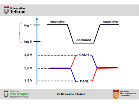 - Logika 0 adalah status dominan. Untuk mengirimkan 0 pada bus CAN, CAN tinggi harus diterapkan pada 3,5V dan CAN rendah harus diterapkan pada 1,5V.