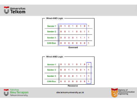 Dari skenario di atas, kita mengetahui bahwa status dominan menimpa status resesif. Ketika node mengirimkan bit dominan dan resesif secara bersamaan, maka bus tetap dominan. Level resesif hanya terjadi ketika semua node mengirimkan bit resesif. Logika semacam itu dikenal sebagai logika AND, dan secara fisik diimplementasikan sebagai rangkaian kolektor terbuka.