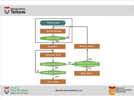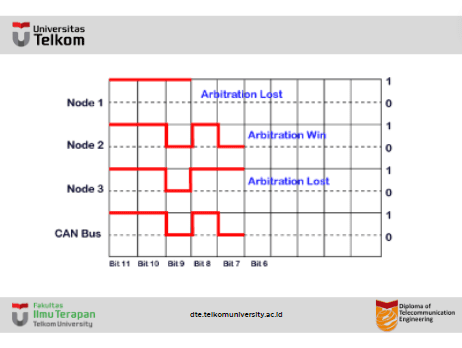 Bit ke -7 : Node 2 mengirimkan bit dominan sementara node 3 telah mengirimkan bit resesif, sehingga status bus akan tetap dominan. Dalam kasus ini, node 3 telah kalah dalam arbitrasi, sehingga berhenti mengirimkan pesan sementara node 2 telah memenangkan arbitrasi yang berarti akan terus menahan bus hingga pesan diterima.