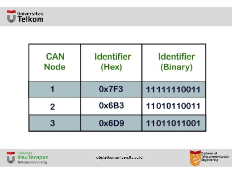 Jika kita mempertimbangkan tiga node, yaitu Node 1, Node 2, dan Node 3, pengenal pesan dari node-node ini berturut-turut adalah 0x7F3, 0x6B3, dan 0x6D9.