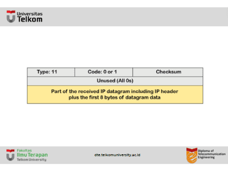 Format pesan di atas menunjukkan bahwa tipe time-exceeded adalah 11, dan kodenya bisa berupa 0 atau 1. Kode 0 mewakili TTL, sedangkan kode 1 mewakili fragmentasi. Dalam pesan time-exceeded, kode 0 digunakan oleh router untuk menunjukkan bahwa nilai time-to-live telah mencapai nol.