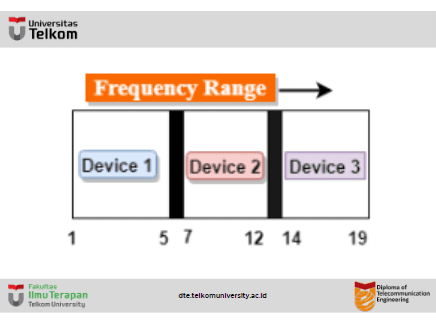 - Pada diagram di atas, satu media transmisi dibagi lagi menjadi beberapa saluran frekuensi, dan setiap saluran frekuensi diberikan ke perangkat yang berbeda. Perangkat 1 memiliki saluran frekuensi dengan rentang 1 hingga 5.