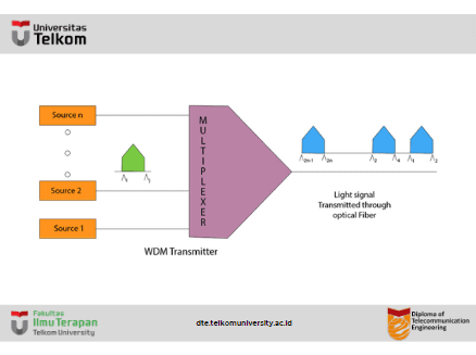 - Sinyal optik dari sumber berbeda digabungkan untuk membentuk pita cahaya yang lebih luas dengan bantuan multiplexer.