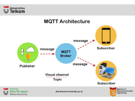 MQTT adalah singkatan dari Message Queuing Telemetry Transport . MQTT adalah protokol konektivitas internet untuk mesin ke mesin. Ini adalah protokol transportasi pengiriman pesan yang sangat ringan dan bersifat publikasi-berlangganan. Protokol ini berguna untuk koneksi dengan lokasi jarak jauh yang bandwidth-nya sangat mahal. Karakteristik ini membuatnya berguna dalam berbagai situasi, termasuk lingkungan yang konstan seperti untuk komunikasi mesin ke mesin dan konteks internet untuk segala hal. Ini adalah sistem publikasi dan langganan tempat kita dapat mempublikasikan dan menerima pesan sebagai klien. Ini memudahkan komunikasi antara beberapa perangkat. Ini adalah protokol pengiriman pesan sederhana yang dirancang untuk perangkat yang terbatas dan dengan bandwidth rendah, jadi ini adalah solusi yang sempurna untuk aplikasi internet untuk segala hal.