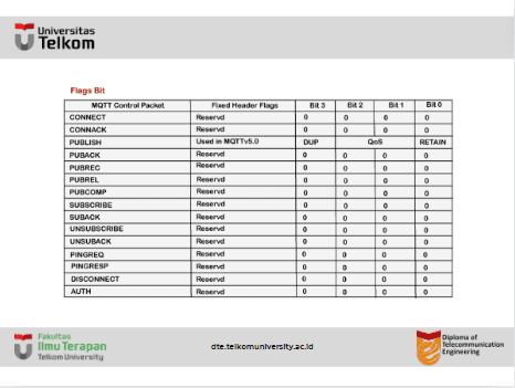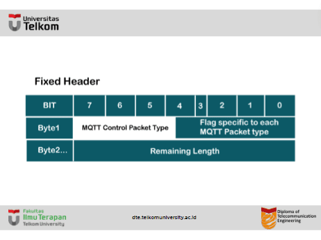 - Bendera khusus untuk tiap jenis paket MQTT: 4-bit sisanya mewakili bendera khusus untuk tiap jenis paket MQTT.