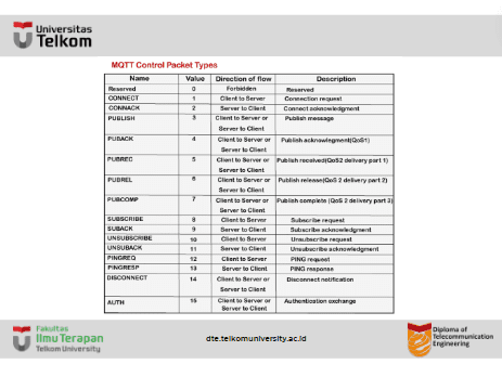 Tabel di atas menunjukkan jenis paket kontrol dengan nilai 4-bit dan arah aliran. Seperti yang dapat kita amati bahwa setiap perintah diikuti oleh pengakuan seperti CONNECT memiliki CONNACK, PUBLISH memiliki PUBACK, PUBREC, PUBREL, dan PUBCOMP, SUBSCRIBE memiliki SUBACK, UNSUBSCRIBE memiliki UNSUBACK.