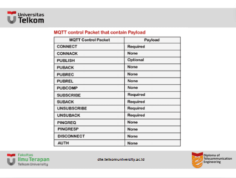Dalam format pesan ICMP, paket kontrol MQTT terakhir adalah payload. Bidang ini berisi data yang akan dikirim. Misalnya, dalam kasus paket CONNECT, payload adalah ID klien, nama pengguna dan kata sandi, dan paket PUBLISH, payload hanyalah pesan aplikasi.