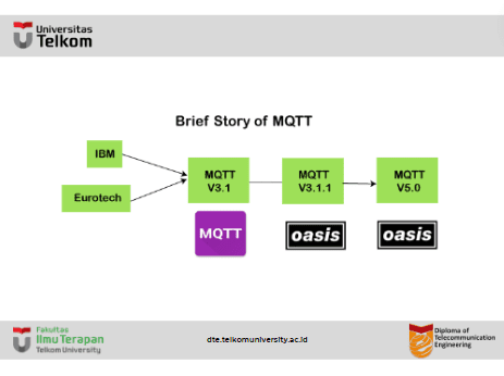 MQTT dikembangkan oleh Dr. Andy Stanford-Clark, IBM , dan Arlen Nipper. Versi protokol 3.1 dan 3.1.1 sebelumnya tersedia di bawah MQTT ORG. Pada tahun 2014, MQTT secara resmi diterbitkan oleh OASIS. OASIS menjadi rumah baru untuk pengembangan MQTT. Kemudian, OASIS memulai pengembangan MQTT lebih lanjut. Versi 3.1.1 sesuai dengan versi 3.1 dan hanya membawa perubahan kecil seperti perubahan pada pesan koneksi dan klarifikasi versi 3.1. Versi MQTT terbaru adalah 5.0, yang merupakan penerus versi 3.1.1. Versi 5.0 tidak sesuai dengan versi 3.1.1. Menurut spesifikasinya, versi 5.0 memiliki sejumlah besar fitur yang membuat kode tetap pada tempatnya.