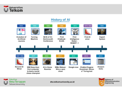 - Tahun 1950: Alan Turing, seorang matematikawan Inggris yang mempelopori pembelajaran mesin, menerbitkan “Computing Machinery and Intelligence” di mana ia mengusulkan sebuah tes yang dapat memeriksa kemampuan mesin untuk menunjukkan perilaku cerdas yang setara dengan kecerdasan manusia, disebut Turing test.