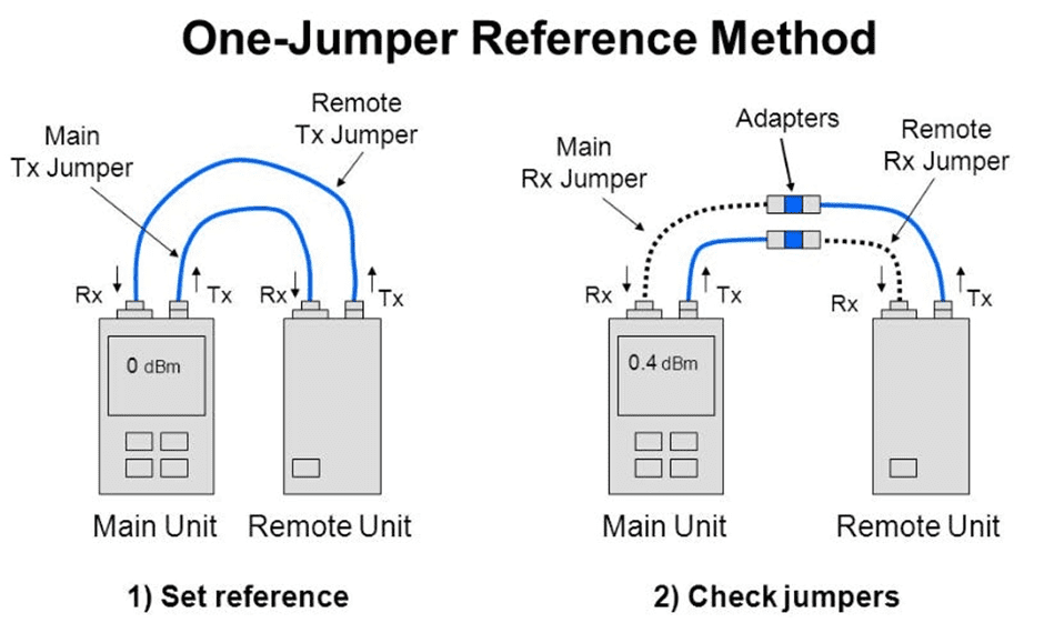 Pengujian pengukur daya dan sumber cahaya, yang juga dikenal sebagai metode satu jumper, adalah cara paling akurat untuk mengukur kehilangan sinyal ujung ke ujung serat, yang disebut sebagai redaman. Berikut ini adalah batas kehilangan penyisipan TIA/EIA-568 untuk berbagai komponen. Instalasi atau protokol tertentu dapat memberlakukan batasan yang lebih ketat.