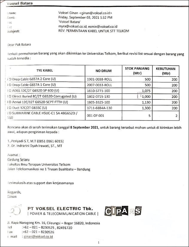 Laboratorium Sistem Komunikasi Optik – Prodi D3TT menerima bantuan Corporate Social Responsibility (CSR) dari PT. Voksel Elektrik Tbk. yang merupakan perusahaan bergerak di bidang industri kabel.
