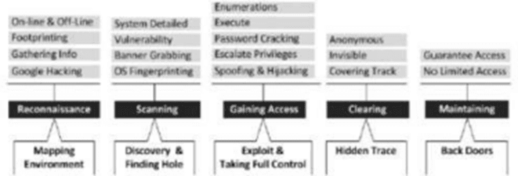 Reconnaissance merupakan tahapan pertama dalam melakukan percobaan untuk menembus atau menyerang (attack) sebuah sistem. Ada beberapa Langkah dan Teknik yang umumnya digunakan Ketika mencoba menembus atau menyerang (attack) sebuah sistem, seperti terlihat pada gamabar di bawah.
