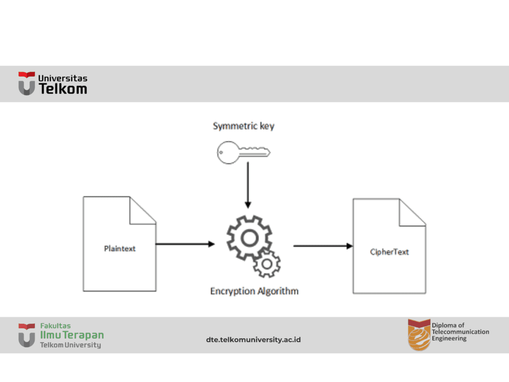 - Enkripsi : Merupakan proses mengolah plaintext (pesan yang dapat dibaca) menjadi ciphertext (pesan yang acak, dan tidak dapat dibaca)