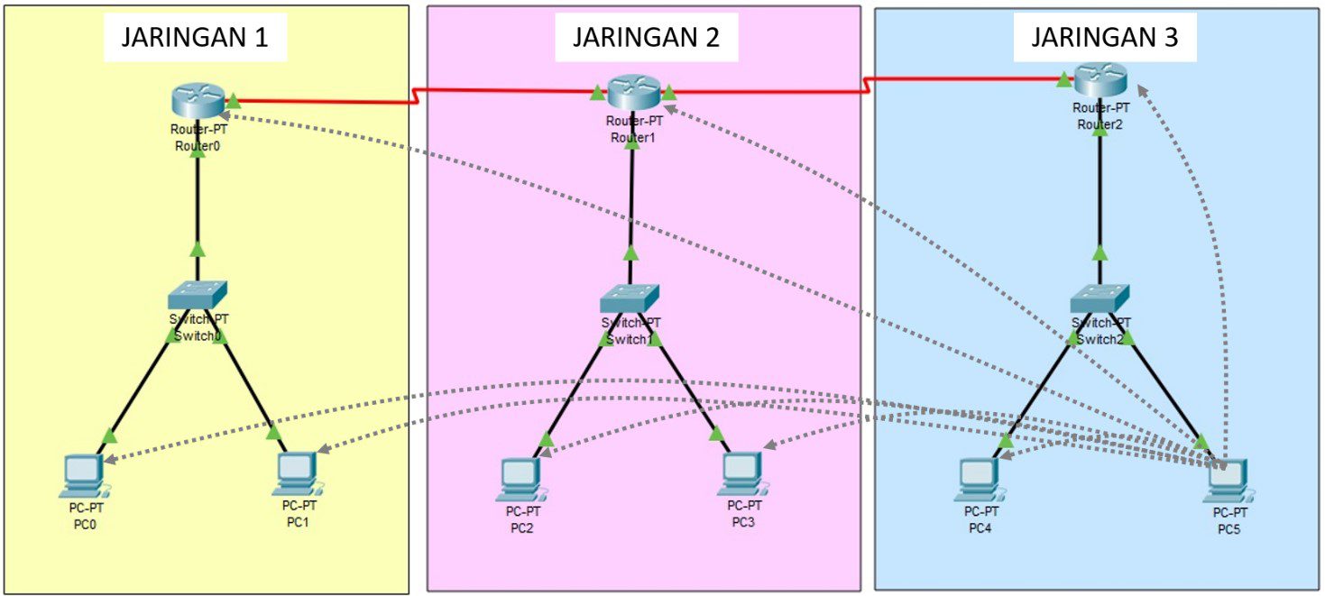Setelah konfigurasi, Anda dapat melakukan tes konektivitas dengan perintah ping dari salah satu PC di jaringan untuk menguji apakah paket dapat mencapai jaringan lain melalui router-router tersebut. Selain itu, perintah traceroute (atau tracert di Windows) dapat digunakan untuk melihat jalur yang dilalui paket data.