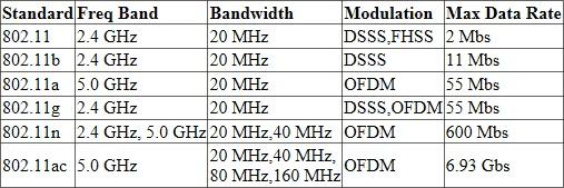 - 802.11b/g: Standar lama, pada pita 2.4 GHz. Kecepatan maksimal belasan hingga puluhan Mbps. Sangat rentan interferensi.