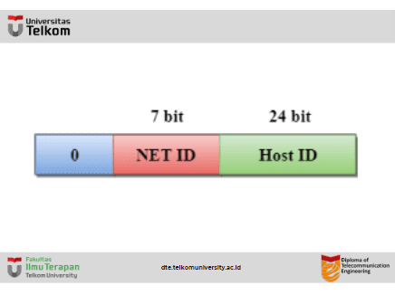 - Di Kelas A, bit pertama dalam bit orde tinggi dari oktet pertama selalu disetel ke 0 dan 7 bit sisanya menentukan ID jaringan. 24 bit menentukan ID host di jaringan mana pun.