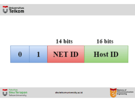- Di Kelas B, bit orde tinggi dari oktet pertama selalu disetel ke 10, dan 14 bit sisanya menentukan ID jaringan.