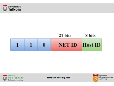 - Di Kelas C, bit orde tinggi dari oktet pertama selalu disetel ke 110, dan 21 bit sisanya menentukan ID jaringan.