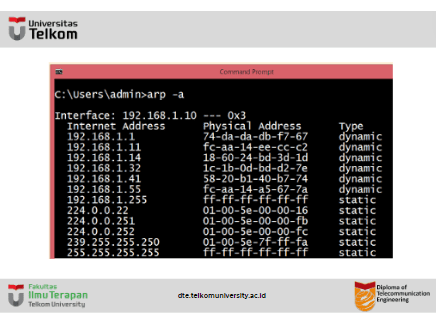 - Jika perangkat menerima alamat MAC, maka alamat MAC akan disimpan dalam cache ARP. Kita dapat memeriksa cache ARP di command prompt dengan menggunakan perintah arp -a.