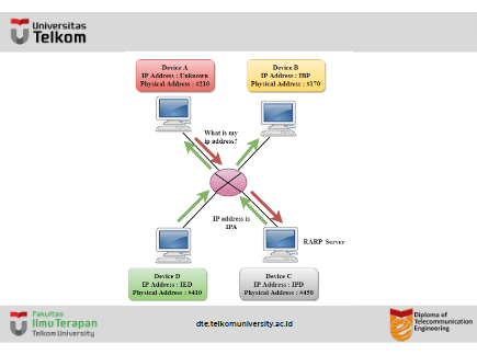 - Jika host ingin mengetahui alamat IP-nya, maka ia menyiarkan paket query RARP yang berisi alamat fisiknya ke seluruh jaringan. Server RARP di jaringan mengenali paket RARP dan merespons kembali dengan alamat IP host.