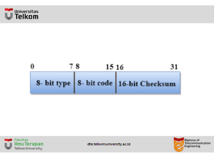 - Bidang checksum mencakup seluruh pesan ICMP.