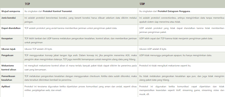 Mari kita lihat perbedaan antara TCP dan UDP dalam bentuk tabel.